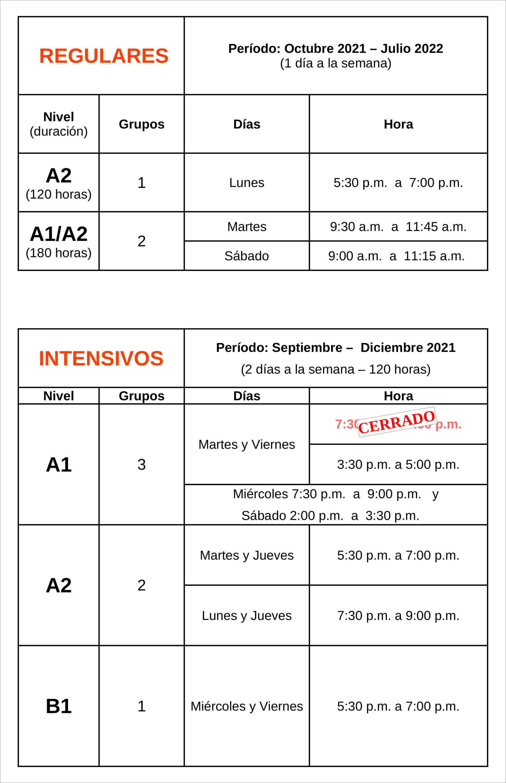 Cursos en Grupo Con un mínimo de 6 y un máximo de 15 alumnos, con un horario fijo de clases síncronas previamente establecido. Cursos Grupales Activos(Hora local de Venezuela ) PRÓXIMAS INSCRIPCIONES EN JULIOPARA INICIAR EN EL MES DE SEPTIEMBRE